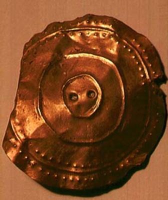 Sonnenscheibe von Banc Ty’nddôl, Bronzezeitliches Goldartifakt im Amgueddfa Cymru Museum, Wales.