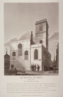 All-Hallows-the-Great war ein Kirchengebäude in barocker Stil an der Upper Thames Street mit gerundeten Fenstern und massiven Steinmauern. Die Struktur prägte seit Jahrhunderten das Erscheinungsbild der Uferzone, bis bedeutende Umbauten im 19. Jahrhundert stattfanden.