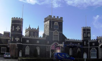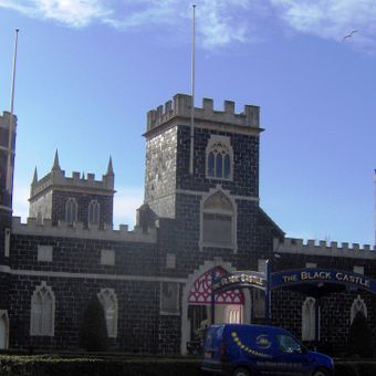 Das Black Castle Public House zeigt an jeder Ecke kreisförmige Türme, die durch zweistöckige Blöcke verbunden sind und einen geschlossenen quadratischen Innenhof bilden.