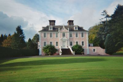 Das georgianische Herrenhaus zeigt traditionelle schottische Architekturelemente mit einem Haupteingang, der das Baujahr 1729 präsentiert.