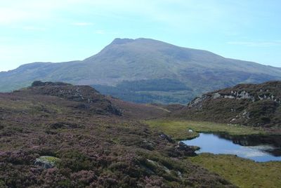 Moel Siabod ist ein Berggipfel von etwa 872 Metern Höhe in der walisischen Grafschaft Conwy mit markanten steilen Klippen auf der Ostseite und sanfteren Hängen im Westen. Die Landschaft zeigt eine vielfältige Topografie, die sowohl herausfordernde als auch zugänglichere Wege zum Gipfel bietet.