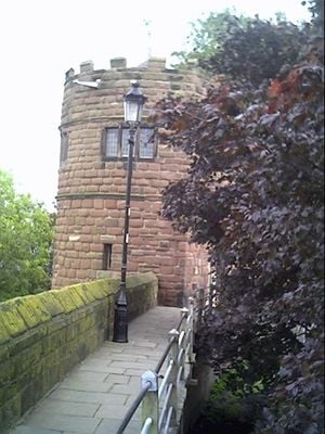 Besucher erreichen den Turm über die Stadtmauer von Chester mit Ausblick auf die umgebende Landschaft und mittelalterliche Befestigungen.