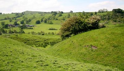 Pilsbury Castle ist eine normannische Befestigung mit zwei Wallgräben in erhöhter Lage über dem Fluss Dove in Derbyshire. Die sichtbaren Erdwälle markieren die ursprüngliche Anordnung von Motte und Baileys.