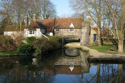 Pulls Ferry ist ein Flusstor aus Flintstein an der Wensum in Norwich mit einem breiten Steinbogen, das neben der Kathedrale steht. Das mittelalterliche Bauwerk verbindet den Fluss mit dem Landungsplatz und war ursprünglich mit einer Schleuse ausgestattet, um die Wasserströmung zu kontrollieren.