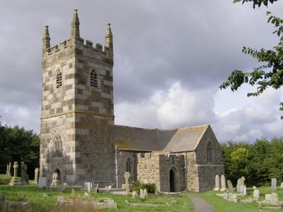 Die Kirche verfügt über einen Steinturm, traditionelle Cornwall-Granitbauweise und detaillierte Steinmetzarbeiten, die mittelalterliche Kirchenarchitektur darstellen.