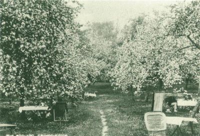 Der Teegarten The Orchard erstreckt sich über grüne Flächen mit Obstbäumen, wo Besucher in traditionellen Liegestühlen sitzen können.