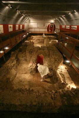 Ein Stahlgewölbe um die archäologischen Überreste schützt die Struktur und ermöglicht Besuchern die Untersuchung der erhaltenen römischen Badeanlagen unter einer modernen Autobahn.