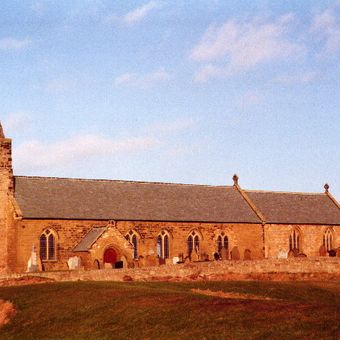 Die St.-Bartholomäus-Kirche steht auf Church Point Headland mit ihrem Turm, der von mehreren Stellen entlang der Küste von Northumberland sichtbar ist.