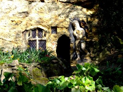 Die Kapelle Unserer Lieben Frau vom Felsen ist in die Kalksteinklippen entlang des Flusses Nidd gehauen, mit Steinmetzarbeiten und Gewölbedecke.