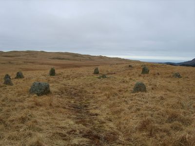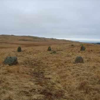 Der prähistorische Komplex enthält 403 Steinhügel, fünf Steinkreise, sechs Steinbänke und zwei Mauern, die sich über die Burnmoor-Landschaft erstrecken.