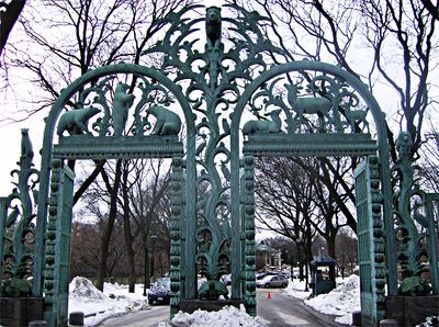 Die Rainey Memorial Gates sind eine bronzene Eingangstoranlage im Bronx Zoo mit geschnitzten Tierfiguren, darunter ein zentraler sitzender Löwe. Die Tore sind über Bronze-Laubengänge mit Granit-Pförtnerlogen verbunden.