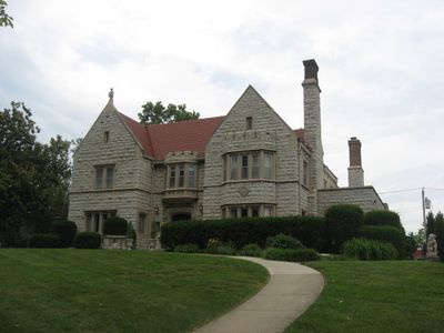 Das Stephen A. Gerrard Herrenhaus verfügt über Kalkstein-Außenwände, ein Schieferdach und architektonische Elemente wie zinnenbekrönte Erkerfenster.