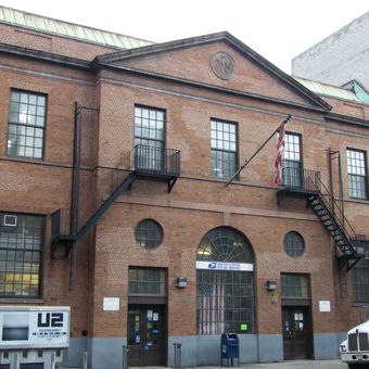 Die United States Post Office Knickerbocker Station ist eine Postfiliale aus den 1930er Jahren in der Lower East Side von Manhattan. Das Gebäude zeigt eine schlichte, symmetrische Ziegelfassade mit klassischen Säulen und Steintrimmen, die das Kolonialrevival-Stil widerspiegeln.