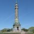Das Granitdenkmal erhebt sich 112 Fuß hoch, mit Bronzestatuen von vier weiblichen Figuren am Sockel und dem Friedensengel an der Spitze.