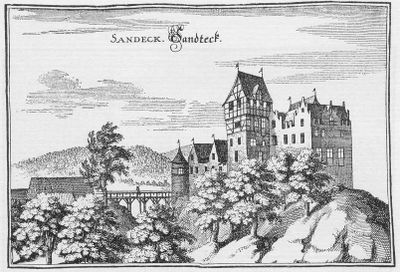 Frühe Besiedlung geht auf das 8. Jahrhundert zurück, als ein fränkischer Landbeamter namens Sintlaz am Ort lebte. Die Burg erlebte verschiedene Umbauten und endete 1833 durch einen Brand während Renovierungsarbeiten.
