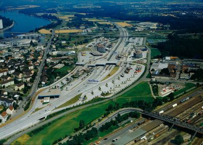 Die Grenzbrücke erstreckt sich über 1476 Meter über mehrere Verkehrswege und verbindet die deutsche Autobahn A5 mit der schweizerischen Autobahn A2.