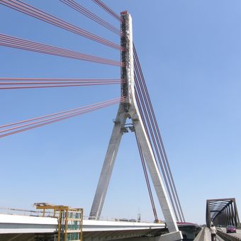 Die Niederrheinbrücke erstreckt sich über 773 Meter über den Rhein mit einer Hauptspannweite von 335 Metern und einem 130 Meter hohen Pylon.