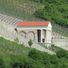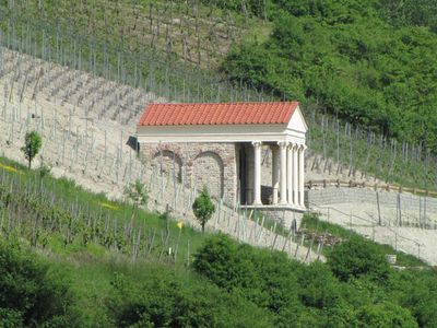 Das Grutenhäuschen zeigt eine zweistöckige Steinstruktur mit Säulen, die sich an einem Weinberghang entlang einer alten Römerstraße befindet.