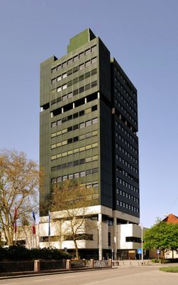 Das neue Rathaus zeigt moderne Architektur mit geraden Linien und erstreckt sich über siebzehn Stockwerke, wodurch eine markante Struktur im Stadtbild entsteht.