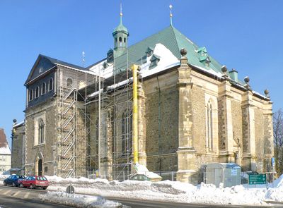 Die St. Salvatoris Kirche weist eine Ziegelfassade mit Giebeldächern, große Bogenfenster und Dachtürme auf, die aus Grauwacke und Sandstein gebaut wurden.