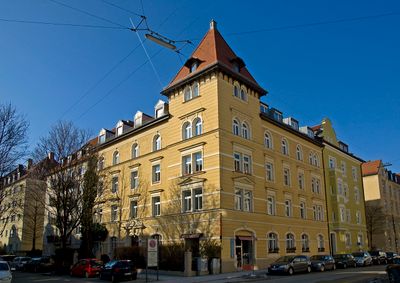 Mietshaus, viergeschossiger Neurenaissance-Eckbau mit Zeltdach-Eckturm sowie Putz- und Stuckgliederung, 1890–1891; 1900–1901 wohnte hier Wladimir Iljitsch Lenin.