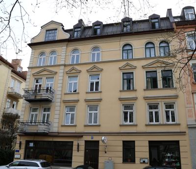 Mietshaus, viergeschossiger Mansarddachbau in Neurenaissanceformen mit übergiebeltem Eckrisalit und Stuckgliederung, Ende 19. Jahrhundert. Dreigeschossiges Rückgebäude mit Balkons und angebautem zweigeschossigem Werkstatttrakt, wohl gleichzeitig.