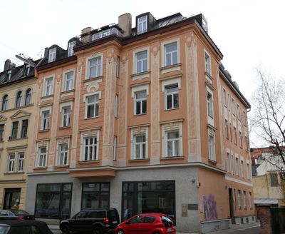 Mietshaus, viergeschossiger neubarocker Mansardwalmdachbau mit Mittelerker und reicher Stuckgliederung, um 1890/1900.