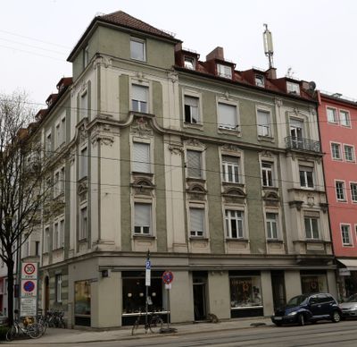Mietshaus, viergeschossiger neubarocker Eckbau mit turmartig erhöhtem Eckrisalit, Erkern und reicher Stuckfassade, 1899–1900 von Anton Wörz.