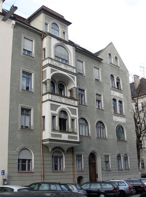 Mietshaus, viergeschossiger putzgegliederter Walmdachbau in deutschen Renaissanceformen mit Stuckdekor am Erker und übergiebeltem Eckrisalit, 1899.
