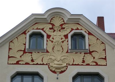 Mietshaus, viergeschossiger Jugendstilbau mit halbrundem Erker, Zwerchgiebel und reichem Putz- und Stuckdekor, 1900 von Eugen Hönig und Karl Söldner. Aktuell wird das Gebäude von der ERES-Stiftung genutzt.