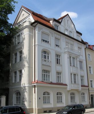 Mietshaus, viergeschossiger Jugendstilbau mit Mansarddach und seitlichem Giebelabschluss, Fassade mit Erkern, übergiebelten breiten Dachhaus und Putzdekor, 1909 von Anton Wörz; Gruppe mit Viktoriastraße 17.