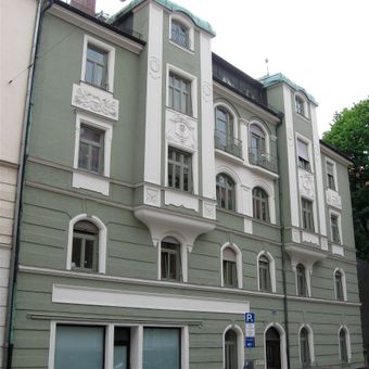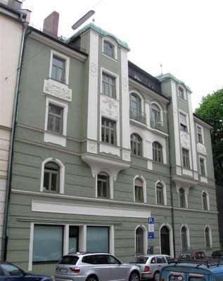 Mietshaus, deutsche Renaissance, mit zwei Erkern und Stuckdekor, 1899 von Fritz Hessemer und Johannes Schmidt; Gruppe mit Nr. 31.