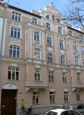 Mietshaus, barockisierender Jugendstil, mit Erkern, Giebel und Stuckdekor, 1904 von Charles Hennek; stattlicher Block mit Nr. 22 und 26.