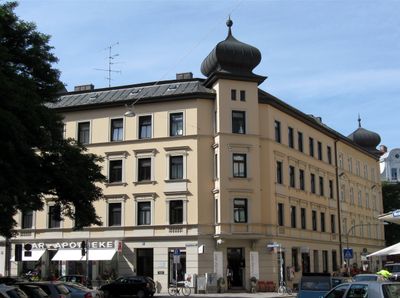 Mietshaus, neurenaissance, mit Erkerturm an der abgeschrägten Ecke, 1882; bildet eine symmetrische Gruppe mit Jahnstraße 25.
