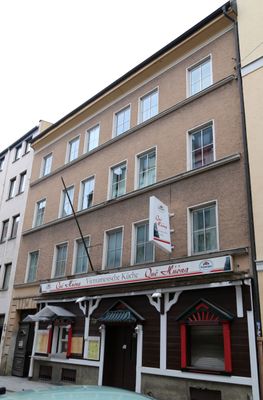 Mietshaus, schlicht, mit Gurtgesimsen und Schnitztür, Mitte 19. Jh.
