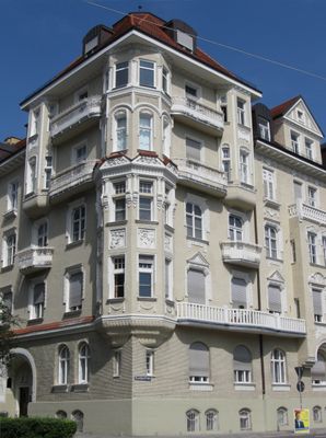 Mietshaus Martiusstraße 7, jugendstil, sehr reich und malerisch gegliedert und stuckiert, mit Reliefs am Eckerker, um 1906 von Anton Hatzl.