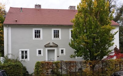 Doppelhaus, sog. Wohnhaus Schmitthenner, zweigeschossiger traufständiger Satteldachbau in klaren Proportionen mit asymmetrischen Freitreppen-Eingängen und schlichter Putzfassade mit sparsamen Schmuckformen, von Paul Schmitthenner (Architekt), 1953/54; mit Vorg