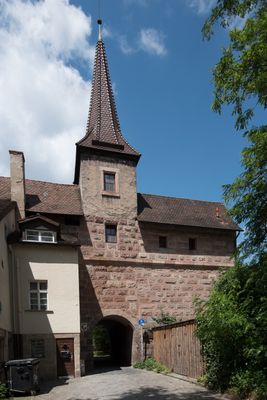 Sogenanntes Hallertor, mit Torturm Grünes G, schlanker Sandsteinquaderbau mit hohem Spitzhelm, mit dem sogenannten Hallertürlein und hohem Spitzhelm, 15. Jh., vorgelagert gerundete Bastion des Zwingers mit überdachtem hölzernem Wehrgang, um 1519