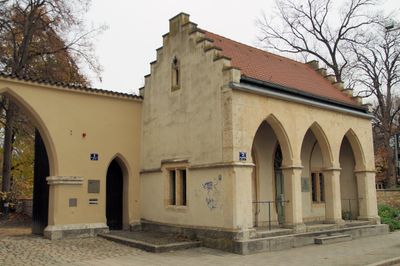 Torwachthaus, eingeschossiges und traufständiges Satteldachhaus mit Treppengiebeln und Arkaden, Werksteingliederungen, neugotisch, 1840
