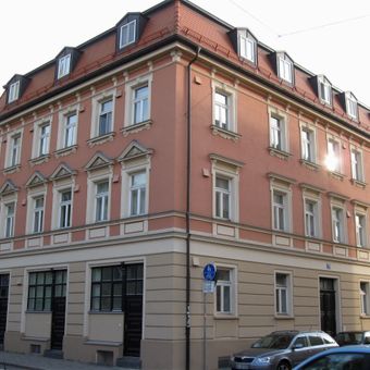 Mietshaus, dreigeschossiger Mansardwalmdachbau in Ecklage, Fassadengliederung in Neurenaissance-Formen, 1887 von Franz Gerner