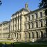 Das Gebäude zeigt das Universitätsmotto 'Veritati Humanitati Virtuti' am Mittelpavillon, mit allegorischen Figuren, die die vier klassischen Fakultäten darstellen.