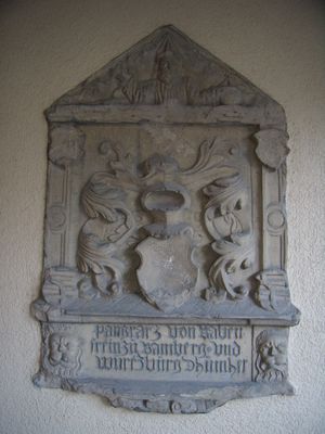 Wappenstein, Ädikula, möglicherweise Teil eines Stiftungsbildes oder eines Epitaphs für den Domherrn Pankratz von Babenstein, sandstein, Renaissance, zweite Hälfte 16. Jahrhundert