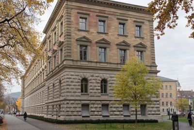 Ehemaliges Königliches Amtsgericht, dreiflügeliger viergeschossiger Walmdachbau mit Kopfbauten und zentraler Giebelfassade in Straßengabelung, kräftig gegliederte Sandsteinobergeschosse über zwei Kalkstein-Rustikageschossen, Neobarock, nach Plänen von Langenfaß, 1889–1892, vere