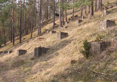 Betonfundamente, Betonfundamente der Versuchstribünenanlage für das Deutsches Stadion (Nürnberg) im Südhang des Hohen Bergs, 1937–1939; an der Straße von Achtel nach Hirschbach
