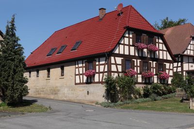 Eingeschossiges Wohnstallhaus, mit Halbwalmdach, Fachwerk über Sandsteinquadersockel, Laube, spätes 18. frühes 19. Jahrhundert; Scheune Fachwerkbau, spätes 18. frühes 19. Jahrhundert