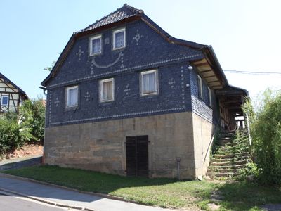Eingeschossiges Halbwalmdachhaus, fachwerk, zum Teil verschiefert, Kellerstall, Laube, Mitte 19. Jahrhundert