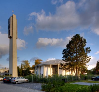 Architekt Gottfried Böhm vollendete diese Betonkirche 1968 als Teil einer Reihe von religiösen Gebäuden im Auftrag der katholischen Erzdiözese Köln.