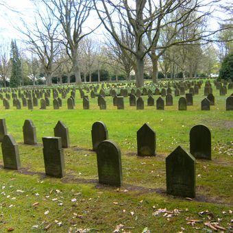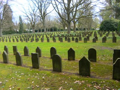 Der Deutsche Militärfriedhof Hamburg-Ohlsdorf zeigt geordnete Gräberabschnitte mit einheitlichen Grabsteinen, die sich über sorgfältig gepflegte Grundstücke erstrecken.
