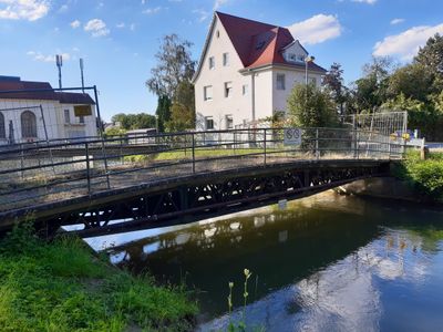 Sogenannte Wiblinger Kanalbrücke, Fischbauchbrücke, linsenförmige Tragkonstruktion aus Eisenelementen, baugleich mit der Fischbauchbrücke Ludwigsfeld, wohl um 1905/10 errichtet und nach 1945 erneuert