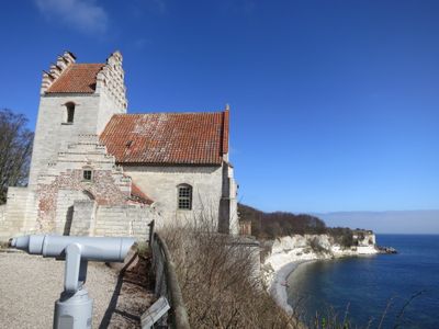 Das weiße mittelalterliche Kirchengebäude steht an Kreidefelsen, mit ockerfarbenen Wandmalereien und einem fehlenden Chorraum, der in die Ostsee stürzte.